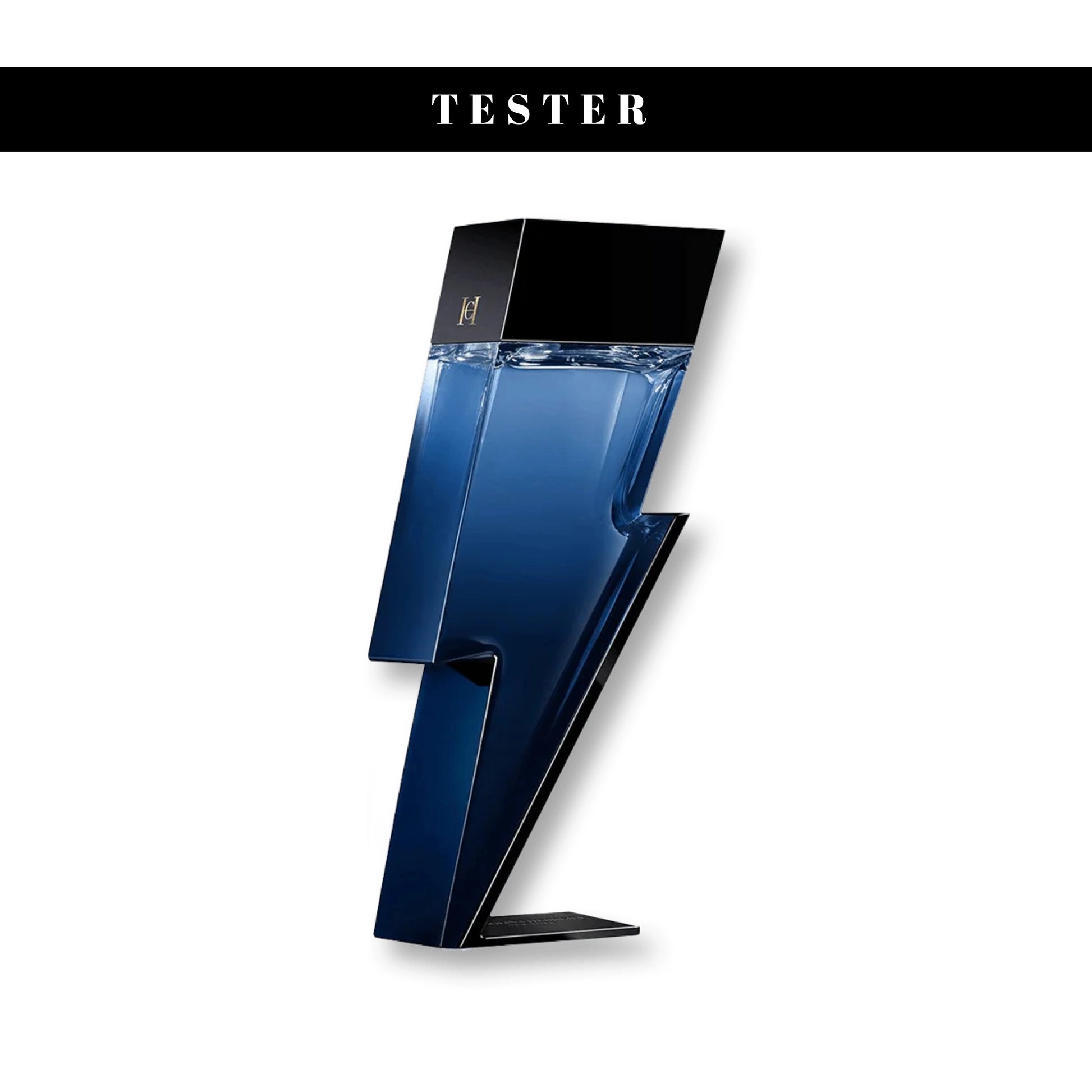 The fragrance is housed in a striking cobalt blue bottle shaped like a lightning bolt, symbolizing its bold and electrifying character.